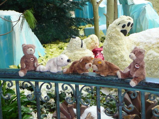 Wie es sich für einen echten Bären-Fan gehört, stand für heute zunächst die Eisbären-Ausstellung im Bellagio auf dem Programm. Nach einem ausgiebigen Frühstück am Hotel-Buffet fuhren wir los. D.h. wir verfuhren uns erst einmal, denn die Desert Inn Road hat eine Unterführung unter dem Strip hindurch, ohne Möglichkeit abzubiegen (oder ich habe diese nicht gesehen). So landeten wir erst einmal auf der anderen Seite der Stadt. Machte nix, diese Ecke kannten wir noch nicht. Etwas später bogen wir dann zum Bellagio Parkhaus ab und wurden vor der Einfahrt noch freundlich von einem Angestellten begrüßt. Mit dem Lift runter ins Erdgeschoss und schon standen wir vor einem 5 Meter großen Eisbären. Diese Ausstellungen im Bellagio sind wirklich immer wieder sehenswert! Otis und Ottilie (zwei unserer Bären) wollten in Las Vegas heiraten und haben sich dann spontan entschlossen, die Zeremonie im Bellagio abzuhalten.